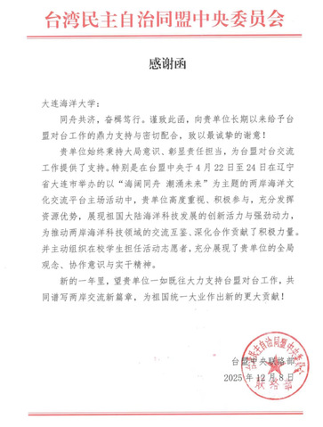 近日,台湾民主自治同盟中央委员会向我校发出感谢函,对我校在大连成功举办的“海阔同舟 潮涌未来”两岸海洋文化交流平台主场活动中所给予的鼎力支持与密切配合,表示高度认可和诚挚感谢。