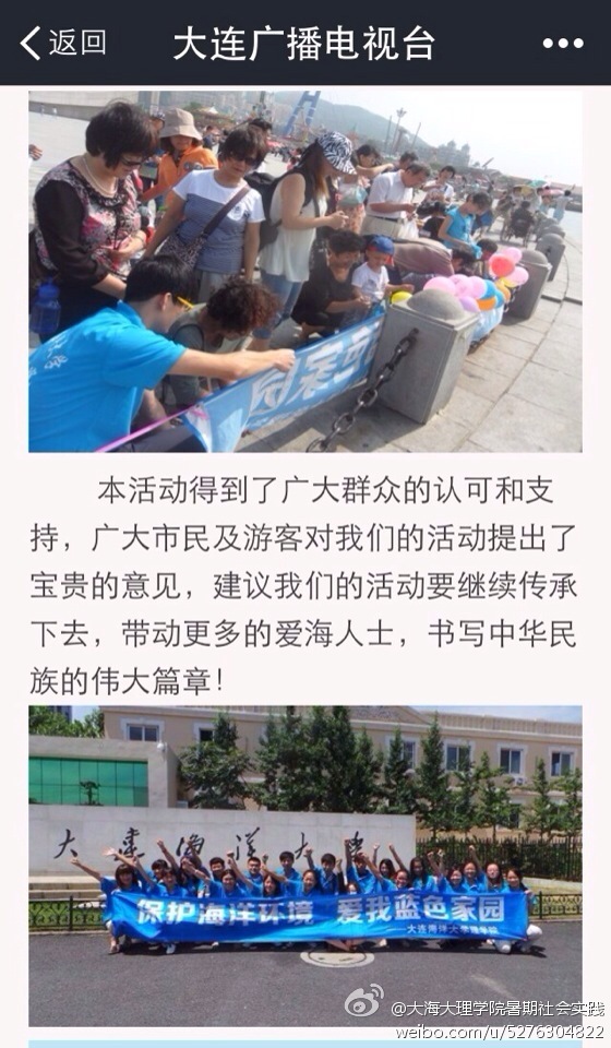 近日,大连新闻网、大连天健网、辽视第一时间、大连广播电视台等多家网络媒体通过微博、微信等形式,以“保护海洋环境,爱我蓝色家园”为主题报道了我校理学院“海洋知识宣传”暑期社会实践活动。