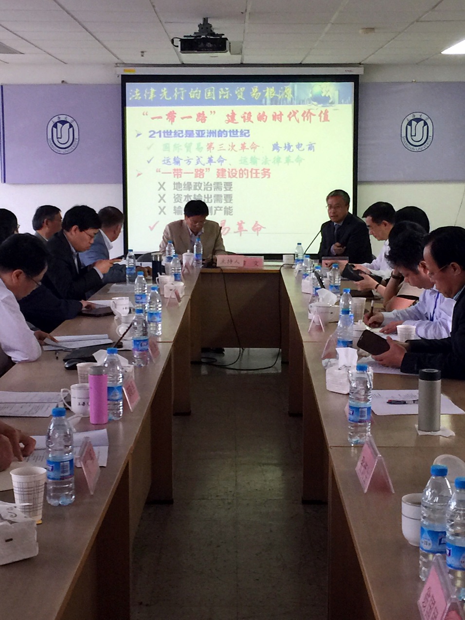 5月23日,由中国国际经济贸易法学研究会暨中国法学会国际经济法学研究会主办的“一带一路”及中国自贸区法治建设上海高层论坛在上海大学(宝山校区)举行。中国法学会国际经济法学研究会会长、澳门科技大学法学院院长沈四宝教授,中国国际经济法学研究会副会长、最高人民法院民四庭庭长罗东川等相关领导、专家、学者共50余人出席了本次论坛。我校法学院(海警学院)教师甘瑞丰、赵昭参加了论坛。