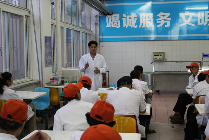 后勤管理处副处长李云鹏通报了省卫生监督局来校检查情况,带领大家学习食堂安全知识,解读相关规章制度。他要求食堂工作人员明确岗位职责,严格考勤考核。就食品采购、保存和加工等方面,他强调,各项采购按规操作,严把进货、加工和质检关,做好“四个卫生”,即做好食品卫生,做好个人卫生,做好环境卫生,做好餐具卫生。