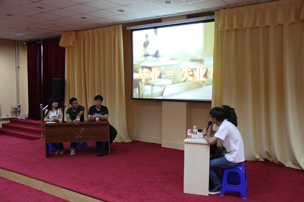 6月11日,外国语学院2015届毕业季“面对面”系列访谈节目第三期就业面对面在黄海校区实阶一举行,学院邀请到优秀毕业生胥子毅、万事成、厍淑琴担任嘉宾,讲述就业经历,分享就业经验。学院团委老师和100余名在校生参加了活动。