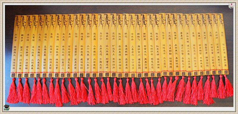 “德才双馨,香象大方”、“纵览五湖,极目四洋“、“海纳百川,耀吾国邦”、“厚德载物,圣启津梁”每支精美内涵的竹简书签,都雕刻有一句《大连海洋大学赋》的诗词和一位毕业生的名字。全班级同学集在一起,就是一幅完整的海洋大学赋。学院领导班子成员走进毕业生宿舍,亲手把竹简书签赠与毕业生,勉励他们要像竹子一样,挺秀有节,柔韧不折,感恩母校,节节登高。