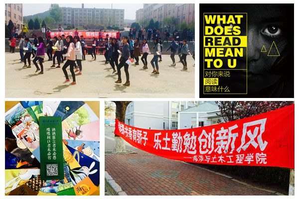 学院2015级学生干部、“海墨书苑”读书社团成员通过张贴海报、展示喷绘、条幅签名、发放精美书签等方式宣传读书活动。同学们还编排了以书籍为道具的舞蹈,参与“快闪”行为艺术表演。