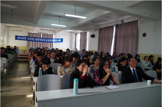 Martin.J.Davies教授以海商法为切入点展开讲座,就海商海事纠纷的管辖、仲裁、移送机制以及国际法依据娓娓道来,还详细介绍了美国和英国的法律体系特点和区别。在提问环节,同学们争先恐后向远道而来的Martin.J.Davies教授提出精心准备的英文问题,其幽默简洁的回答赢得了在场师生的阵阵掌声。