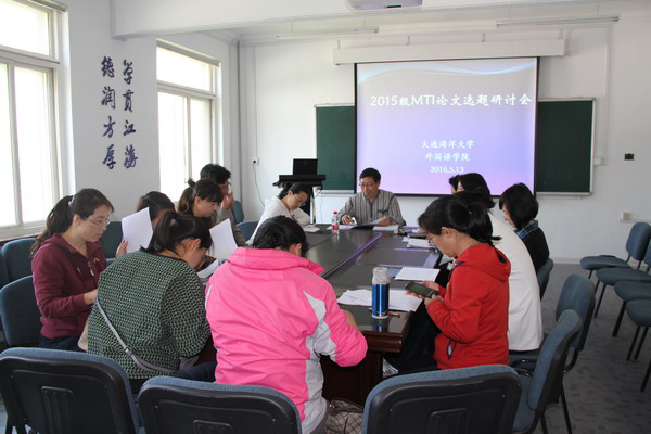 近日,外国语学院在学院会议室召开2015级翻译硕士论文选题研讨会。我校客座教授大连海事大学刘迎春博士应邀参加研讨会,学院全体硕士研究生导师参加会议。