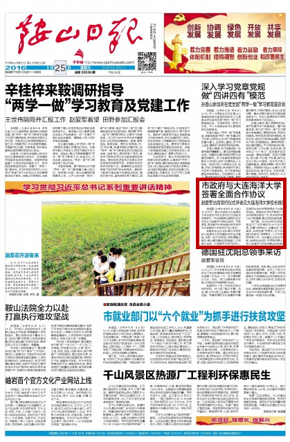 5月25日,《鞍山日报》、光明网、中国海洋网等多家媒体分别报道了我校与辽宁省鞍山市政府签署全面合作协议。鞍山市市长赵爱军,市委常委、常务副市长张世超,我校校长姚杰、副校长宋林生出席会议。张世超与宋林生在协议书上签字。