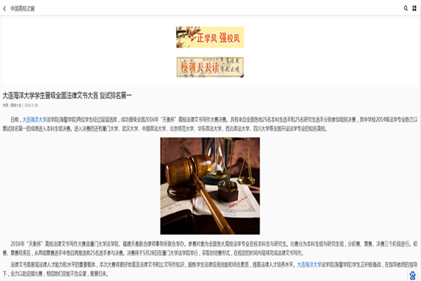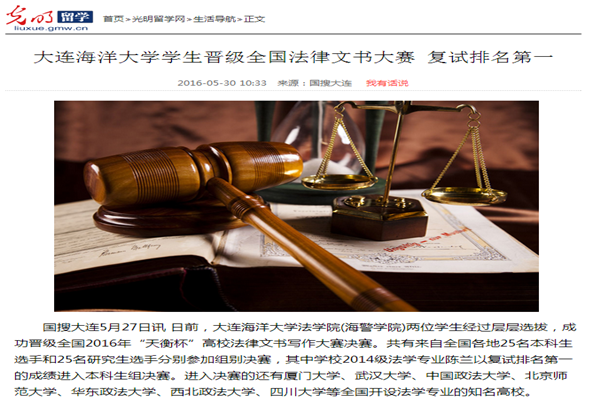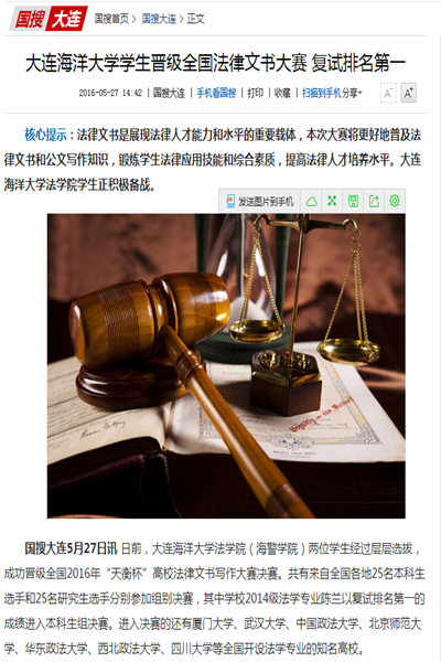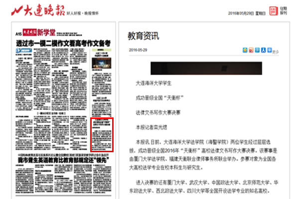 5月29日,《大连晚报》A15版以《大连海洋大学学生成功晋级全国“天衡杯”法律文书写作大赛决赛》为题报道我校学生成功晋级“天衡杯”法律文书大赛决赛。5月27日,“国搜大连”以《大连海洋大学学生晋级全国法律文书大赛 复试排名第一》为题对我校学生成功晋级“天衡杯”法律文书大赛决赛进行了报道。