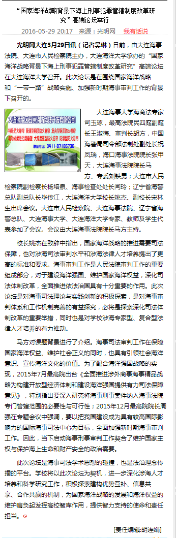 5月29日,光明网报道了“国家海洋战略背景下海上刑事犯罪管辖制度改革研究”高端论坛在我校举行。该论坛由大连海事法院、大连市人民检察院主办,我校承办。