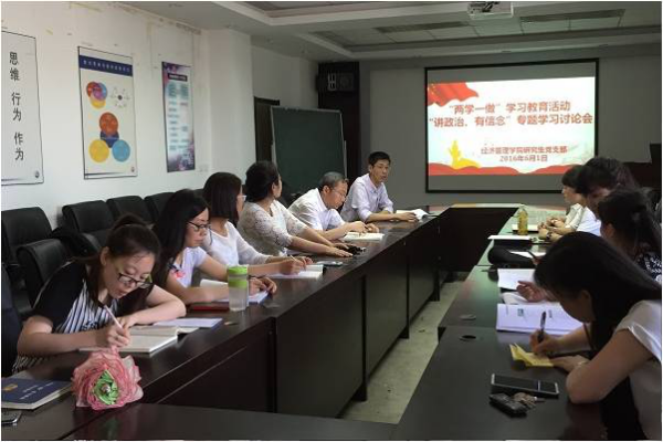 6月1日,经济管理学院研究生党支部在学院会议室召开“讲政治、有信念”专题学习讨论会,学院党总支书记王保良、主管研究生工作副院长张瑜、研究生党支部书记刘富江及支部学生党员参加会议。