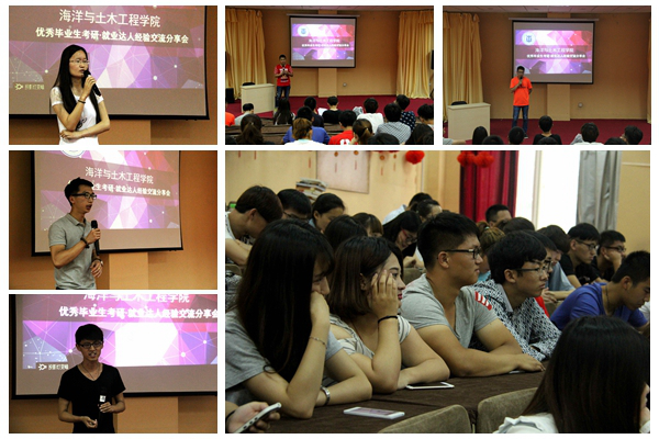 6月16日,海洋与土木工程学院在实阶一举办优秀毕业生之考研、就业达人经验交流会。16届优秀毕业生之“就业达人”——港口航道与海岸工程2012级1班的龚健、郭厚涛,工程管理2012级1班的胡仲兴同学及“考研达人”——港口航道与海岸工程2012级1班的庄峰、郭静静同学担任主讲,为在校学生进行学习、就业经验分享。