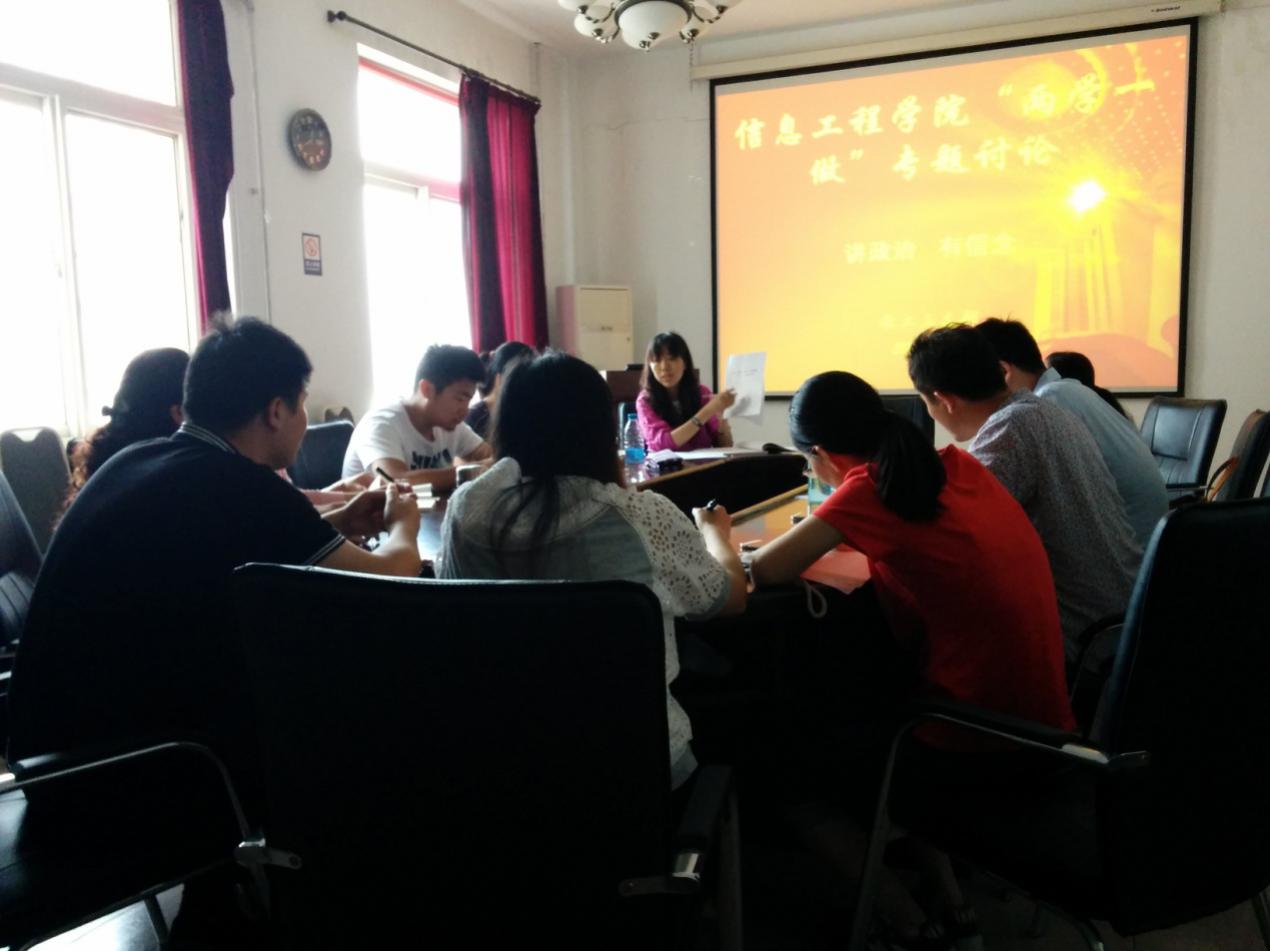 6月22日,信息工程学院教工三支部在学院会议室进行了“讲政治,有信念”专题讨论。学院副院长、党总支委员缪新颖,教工三支部书记张妍及支部全体党员参加会议。