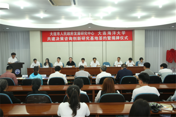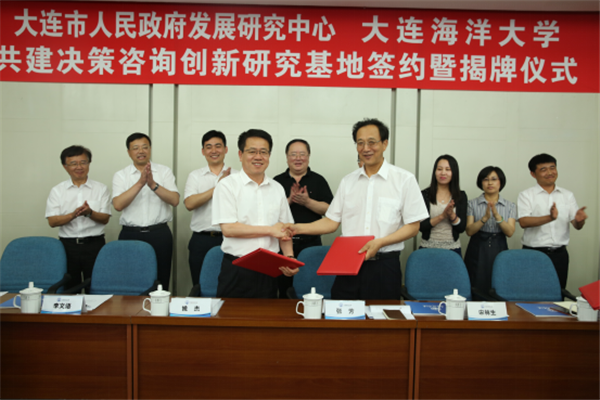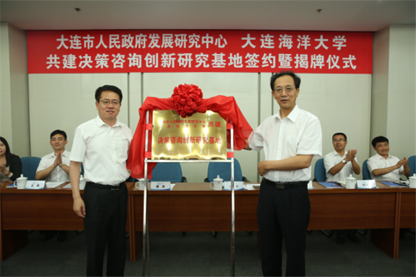 姚杰、张芳分别代表大连海洋大学与大连市政府发展研究中心共同签署了决策咨询创新研究基地框架协议书,并为基地揭牌。
