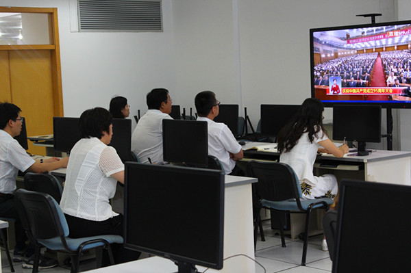 7月1日,图书馆党总支组织党员在图书馆3楼电子阅览室观看“庆祝中国共产党成立95周年大会”网络直播,在岗党员参加了此次活动。