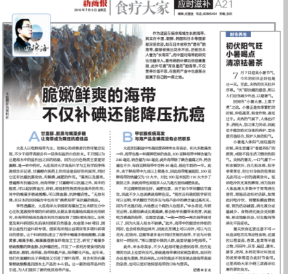 7月6日,《新商报》A21版在《脆嫩鲜爽的海带 不仅补碘还能降压抗癌》文章中,报道了我校国家海藻加工技术研发分中心汪秋宽教授科研团队近年来的科研工作以及所取得的成果。