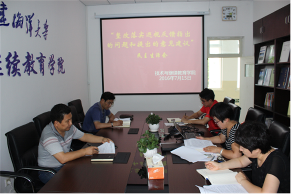 7月15日,技术与继续教育学院在学院会议室召开了学院领导班子“整改落实巡视反馈指出的问题和提出的意见建议”专题民主生活会。学院领导班子成员参加了会议,教工党支部书记、学生党支部书记列席了会议,会议由学院党总支书记邱金英主持。