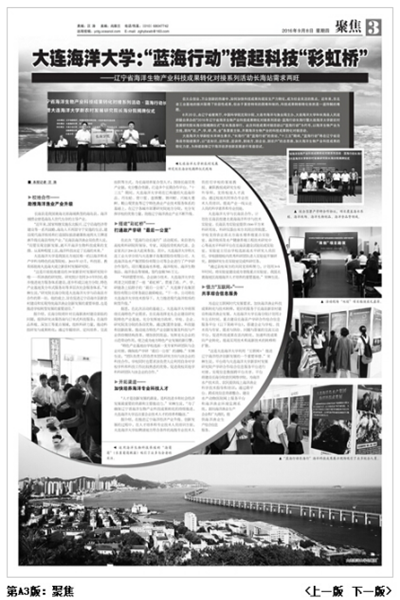 9月8日,《中国海洋报》第1874期A3版以《大连海洋大学:“蓝海行动”搭起科技“彩虹桥”——辽宁省海洋生物产业科技成果转化对接系列活动长海站需求两旺》为题对我校与长海县合作加强海洋生物产业科技成果的转化力度,持续助推辽宁海洋经济的创新发展进行了专题报道。