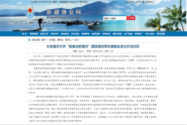 9月18日,新疆渔业网“访民情、惠民生、聚民心”栏目板块以“大连海洋大学‘我身边的海洋’国民海洋意识调查走进立井北社区”为题介绍了我校海洋科技与环境学院在新疆乌鲁木齐市立井北社区开展的“我身边的海洋”国民海洋意识调查活动。