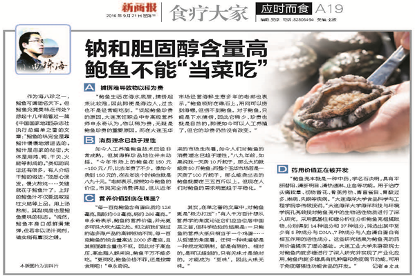 9月21日,《新商报》以“钠和胆固醇含量高,鲍鱼不能‘当菜吃’”为题介绍了我校海洋科技与环境学院教师孔亮及其海洋资源化学研究团队的关于海洋生物活性成分利用的研究成果。