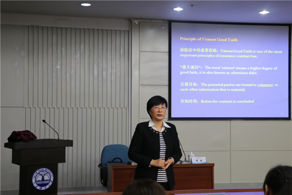 荆真详细讲解了海上保险法的起源、作用、本质、合理性、立法规定及相关案例,中英文交替,极为精彩。她还介绍了班戈(Bangor)大学总体情况和班戈(Bangor)法学院概况,并就法学院现有授课型研究生项目(Taught LLM Programmes)和研究型研究生项目(LLM by Research)展开详细的说明。