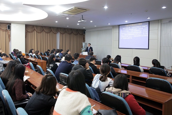 11月18日,经济管理学院第十三期“社会大讲堂”在图书馆多功能厅举办。我校客座教授、大连市对外贸易经济合作局副局长张晓鹏做客本次讲堂。经济管理学院师生代表参加了此次活动。