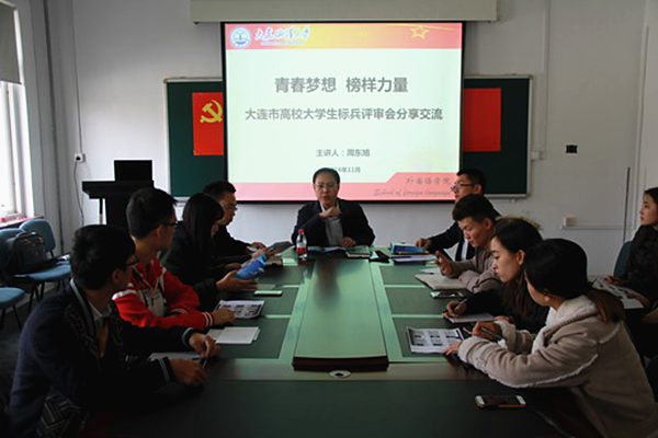 11月16日,外国语学院在一教206教室举行“青春梦想,榜样力量”大连市高校大学生标兵评审会分享交流会。本次会议邀请我校学生工作处副处长周东旭担任主讲,学院辅导员王庆丰、学生党员、学院学生会成员及各班班长参加了本次会议。会议由学院党总支副书记武家春主持。