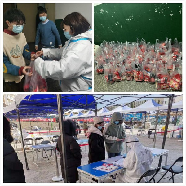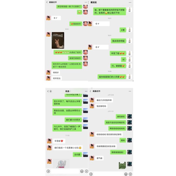 在得知有同学不舒服的时候,她着急又心疼,立即帮助学生们购买药物送去,反复叮嘱学生要谨遵医嘱,定时吃饭吃药。12月25日,她专门走访大四学生宿舍,为考研学生加油打气,带去美好祝愿。在考试当天,她亲自接送考研学生,保证学生们安心完成考试,安全往返于考场与宿舍之间。元旦在即,她带着志愿者们一起将学院送来的物资进行分装发放,反复核查是否有遗漏。她说:“每一个同学肯定都很期待元旦的礼物,我不想让她们失望”。1月初,大连风雪不停。公寓外面的坡路被冰雪覆盖,寸步难行,一次,她刚出楼门就滑倒摔躺在地上,但她还是忍着疼痛站起来继续为同学们送餐送药,一直到晚上回到寝室才简单处理了一下腿上的伤。即使每天忙到很晚,自己很多时候都在吃冷的饭菜,她也会抽出时间询问同学们饭菜是否够吃,生活必需品是否够用。她主动倾听学生诉求,把学校的关怀传递给同学们。1月6日,她组织学生召开了线上会议,再次向同学们强调了防疫期间的纪律,及时回应学生近期普遍关心的开学返校时间、车票退订、实习实践等问题。“虽然有些通知和注意事项已经给同学们说过了,但还是感觉不踏实,得给他们开个电话会议强调一下。” “召开学生电话会议,听到每个人熟悉的声音,听到他们亲口报一声‘我很好’,心理感觉踏实多了”。她的悉心关怀获得了同学们的一致好评,被学生亲切的称为“戴姐姐”。她说“你们放心,我会是你们坚强的后盾。疫情不停歇,我一刻也不会松懈”。