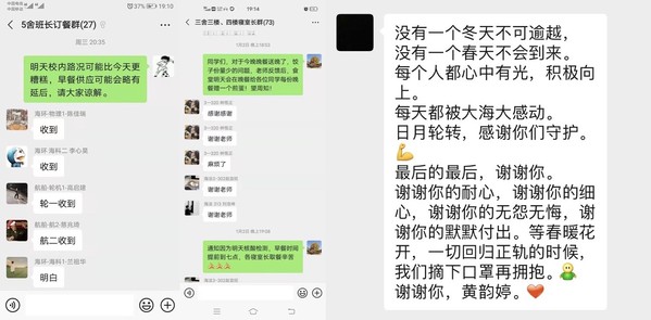 他们是一群可爱的人!他们来自学校不同的部门,党委宣传部李志楠,纪委综合监察室、审查调查室赵小龙,学生工作处郑舒悠,国有资产管理处周韶东,校园规划建设办公室高建伟,水产与生命学院李卓和外国语与国际教育学院黄韵婷。他们的年龄从70、80后到90后,老中青三代人在学校疫情防控关键时期向组织申请到抗“疫”一线工作,他们每个人都有自己的本职工作,在做楼宇管理员的同时,本职工作依然不缺位、不含糊。他们坚守在疫情防控第一线,用责任与担当、用热爱与奉献,守好每一座楼宇,护好每一名学生。
