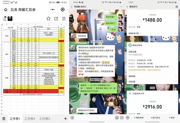 下午是各寝室订餐时间,各楼层寝室长微信群会不时的出现第二天早、中、晚三餐的订餐数量,整理订餐数据、收取餐费、转账付款,这也是所有楼宇管理员最幸福的时候!