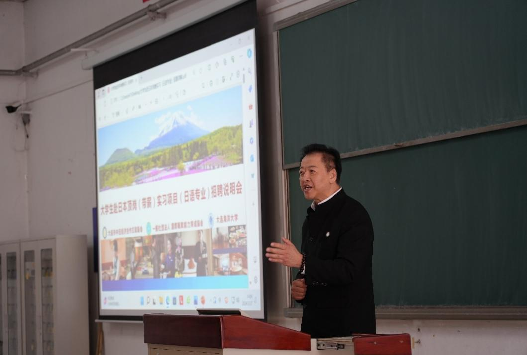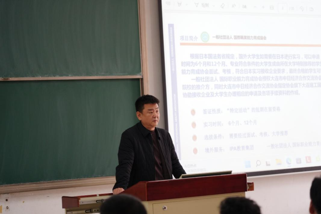 大连市中日经济合作交流协会薛世勇副会长代表日本一般社团法人职业技能育成协会做了带薪实习项目介绍;我校首批赴日实习项目回国学生吴西含同学分享了海外实习经验。