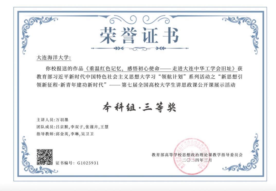 近日,教育部习近平新时代中国特色社会主义思想大学习领航计划主题教育系列活动评选结果公布。在“‘新思想引领新征程 新青年建功新时代’——第七届全国高校大学生讲思政课公开课展示活动”单元,由马克思主义学院研究生万羽墨、李双子、吕京默、张谨卉、王慧共同创作,教师邱金英、李琳、吴卫卫指导的《重温红色记忆,感悟初心使命——走进大连中华工学会旧址》荣获本次大赛三等奖。