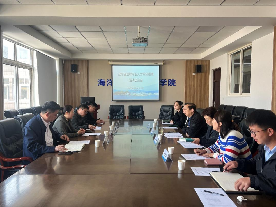 5月7日,海洋法律与人文学院在学院会议室召开辽宁省法律专业人才专场招聘活动座谈会。辽宁省司法厅律师工作处处长王燕、三级主任科员鄂昭,以及大连市律师协会实习管理与考核委员会主任唐鹏林、秘书处秘书宋述山一行到访学院调研。学院院长裴兆斌热情接待王燕一行,学院副院长王黎黎、曲亚囡,纪委书记蔺妍,辅导员杨学钱、张曼群参加会议。