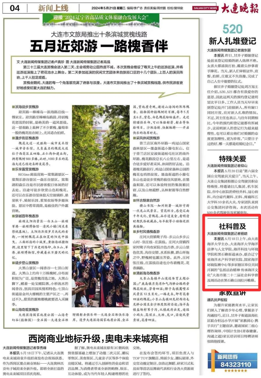 近日,《大连晚报》在04版报道我校海洋法律与人文学院、海洋科技与环境学院与黑石礁街道等多家单位联合举办的“弘扬法治精神 传承海洋文化”社科普及周活动。