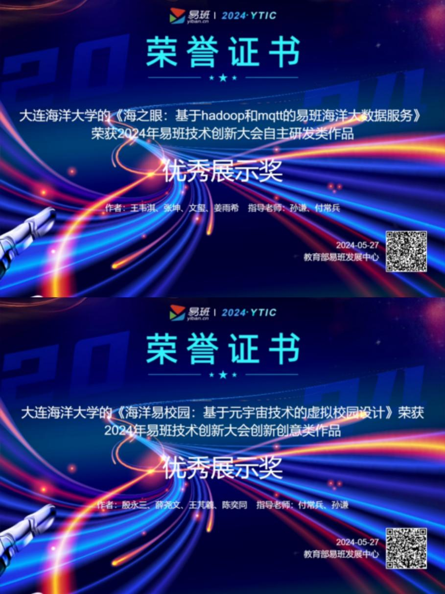 5月24日至27日,2024年全国高校易班技术创新大会在海南陵水举行。我校作品《海之眼:基于hadoop和mqtt的易班海洋大数据服务》荣获2024年易班技术创新大会自主研发类作品优秀展示奖;《海洋易校园:基于元宇宙技术的虚拟校园设计》荣获2024年易班技术创新大会创新创意类作品优秀展示奖。