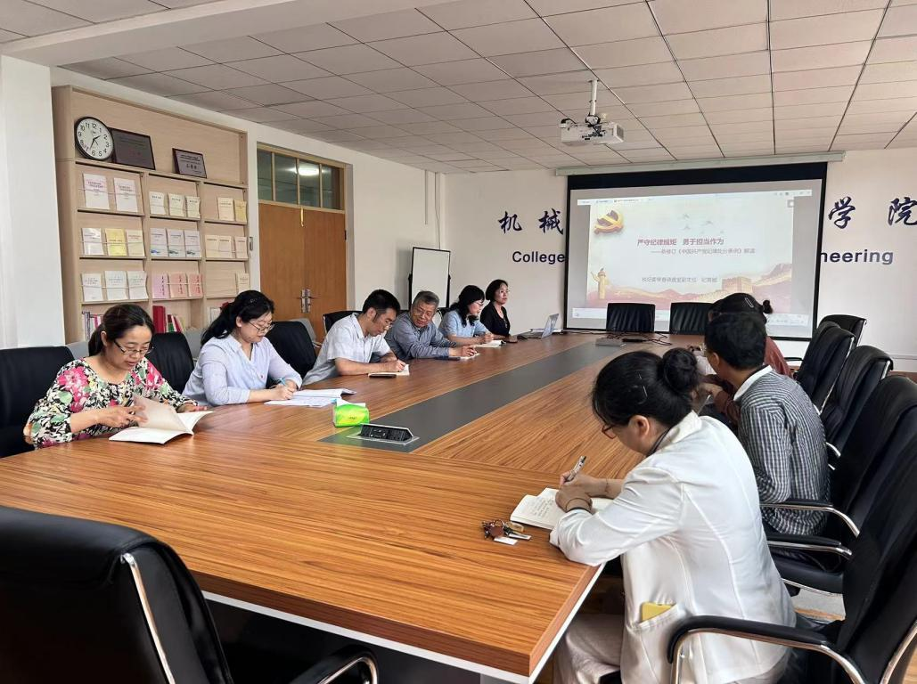 为深入学习贯彻修订后的《中国共产党纪律处分条例》,推进全面从严治党走深走实,6月12日,能源与动力工程教研室党支部和教学质量监控与评估中心党支部在机械与动力工程学院会议室举办党纪学习教育宣讲会。会议邀请我校纪委审查调查室副主任纪常鲲担任主讲人。两个支部的教工党员参加本次活动。活动由教学质量监控与评估中心党支部书记汪德洪、能源与动力工程教研室党支部书记于靖博共同主持。