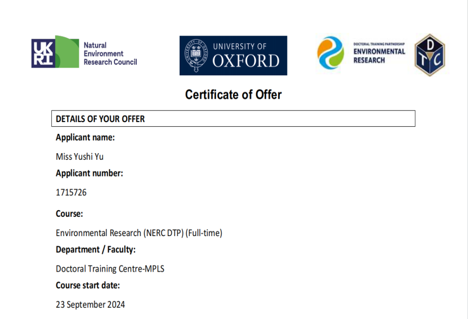 近日,海洋科技与环境学院2021级海洋科学专业硕士研究生喻雨诗同学荣获英国牛津大学博士研究生录取资格,并斩获DTP(Doctoral Training Partnership)全额奖学金,成为该专业今年录取的唯一的一位中国籍学生。这一成就不仅是对学生个人学术追求和努力的肯定,也是学院乃至学校教育质量与国际竞争力的显著体现。