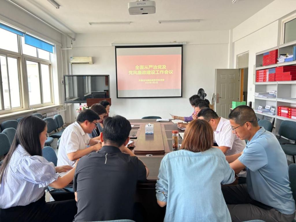7月3日,外国语与国际教育学院党委在学院党员活动室召开全面从严治党及党风廉政建设工作会议。学院科级以上干部、党支部书记、教研室主任、办公室负责人参加会议。会议由学院党委书记邓艺主持。