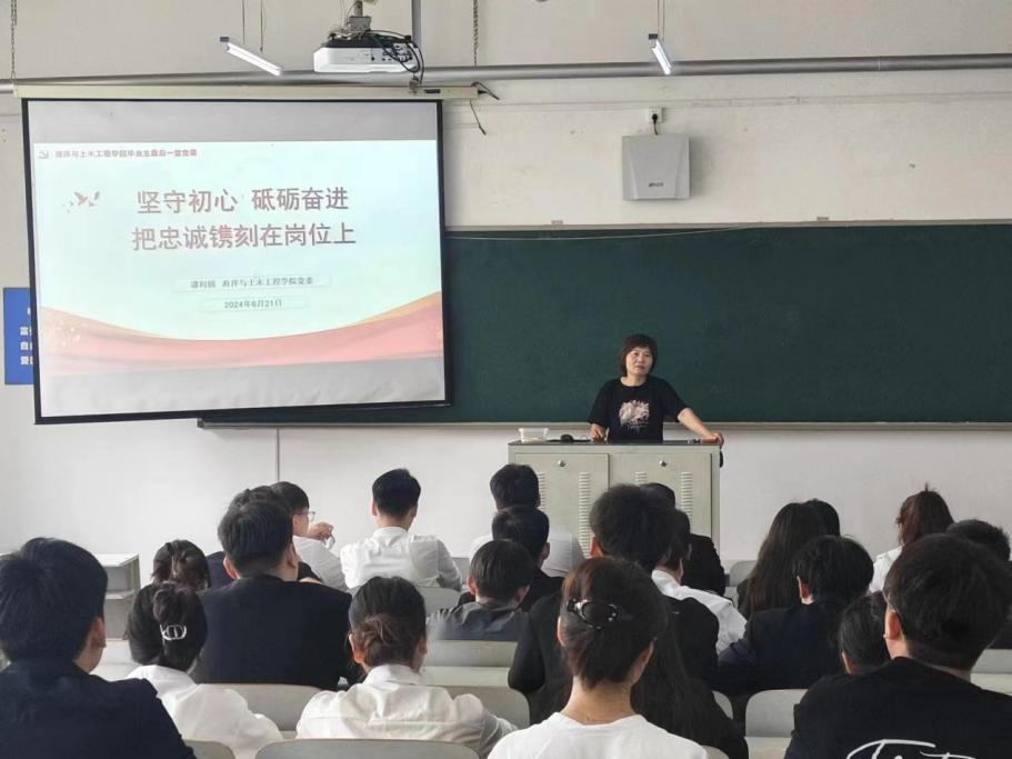 为进一步强化毕业生党员的政治意识、身份意识和廉洁意识,引导毕业生坚定理想信念,在实干担当中锤炼党性修养,近日,海洋与土木工程学院党委副书记谭利娟在獐子岛教学楼104教室为本科生、研究生毕业生党员上了最后一堂党课,党课后大家一起重温入党誓词。