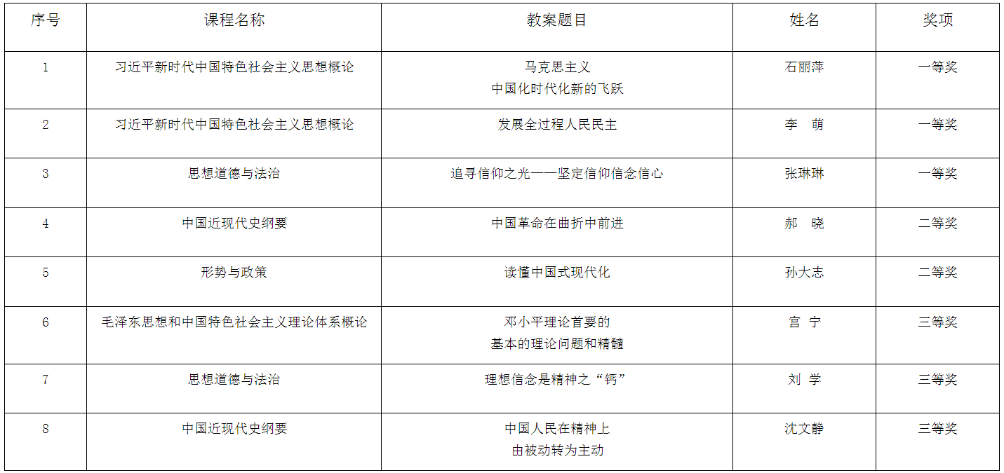 近日,辽宁省教育厅公布了2024年辽宁省高校思想政治理论课精品教案获奖名单,我校八位思政课教师申报的教案获奖。其中,石丽萍、李萌、张琳琳荣获一等奖;郝晓、孙大志荣获二等奖;宫宁、刘学、沈文静荣获三等奖,获奖数量创历史新高。