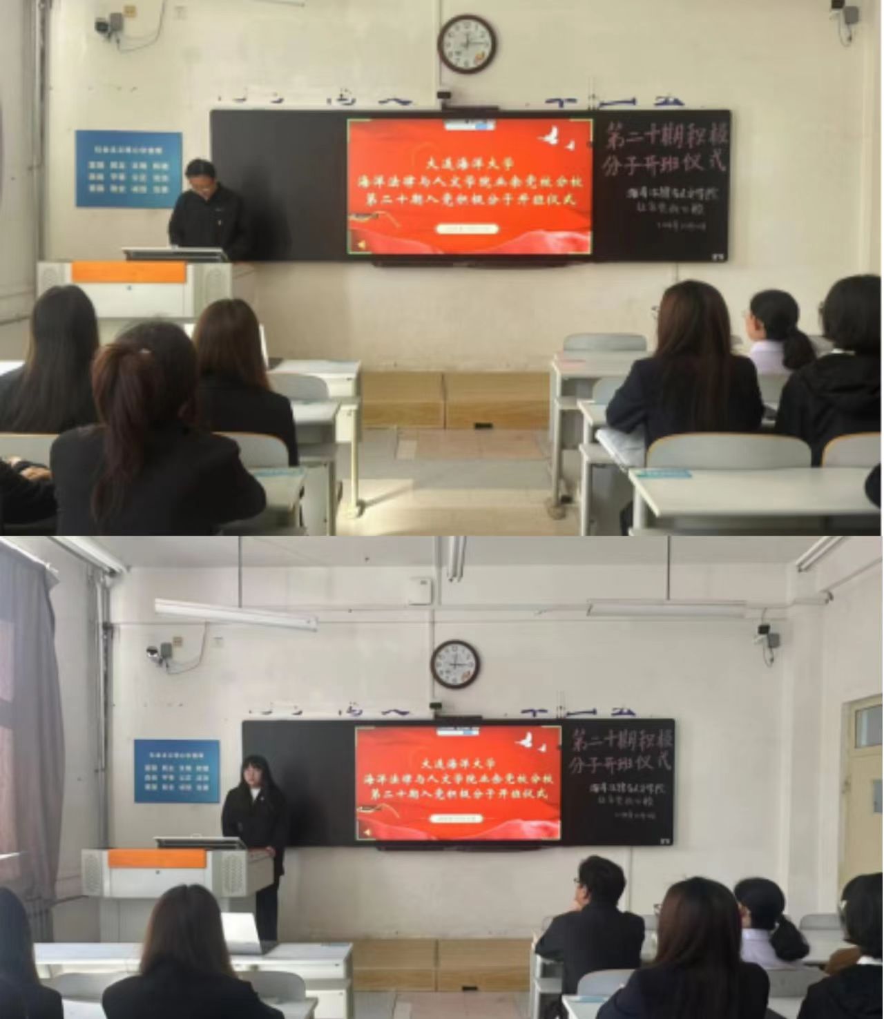 10月11日,海洋法律与人文学院于大黑石校区2-107教室召开第二十期入党积极分子培训班开班仪式。学院业余党校分校校长、学院党委书记高雪梅,党校分校副校长、党委副书记滕鹏,团委书记郭昕黎,研究生、本科生学生党支部书记及第二十期入党积极分子参与本次开班仪式。本次会议由本科生党支部书记宋敬星主持。