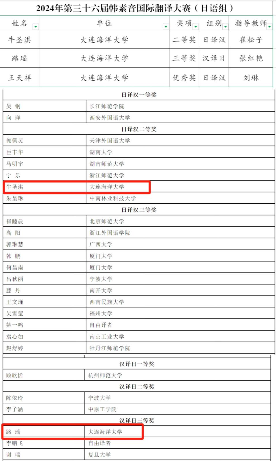 10月16日,2024年第三十六届韩素音国际翻译大赛结果公布,我校外国语与国际教育学院3名同学在日语组取得优异成绩。日语教师崔松子指导的学生牛圣淇获得日译汉组二等奖(全国排名第七),张红艳老师指导的学生路瑶获得汉译日组三等奖(全国排名第四),刘琳老师指导的王天祥同学获得日译汉组优秀奖,创造了我校在该项赛事上的最好成绩。