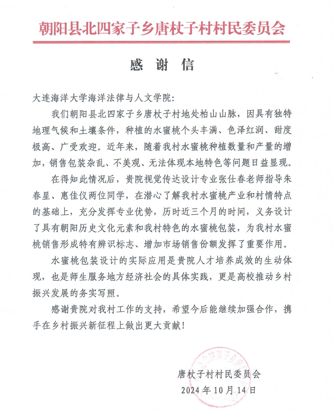 近日,朝阳县北四家子乡唐杖子村向我校发来感谢信,感谢海洋法律与人文学院视觉传达设计专业张仕春老师和朱春星、惠佳仪两名同学,义务设计了具有朝阳历史文化元素和唐杖子村特色的水蜜桃包装,为服务地方经济社会发展、推动乡村振兴作出了贡献。