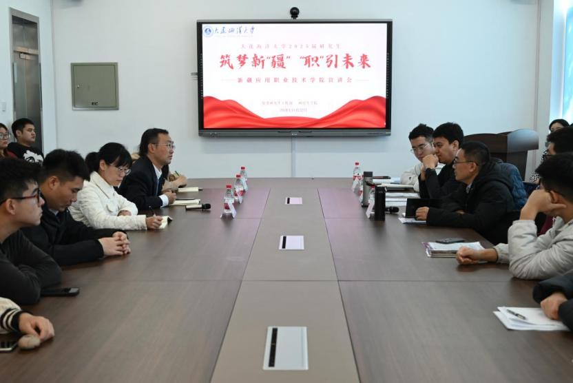 为鼓励研究生到中西部地区和艰苦边远地区基层单位就业,为区域发展提供人才支持和智力支撑,11月22日,党委研究生工作部在北院四号楼206举办筑梦新“疆”,“职”引未来——新疆应用职业技术学院宣讲会。新疆应用职业技术学院组织人事部副部长王磊、石油与化学工程学院党总支副书记、副院长王明权和经济管理学院教师王皓等人,我校党委研究生工作部副部长吕顺、教育管理科科长李枫、外国语与国际教育学院辅导员刘家馨以及在籍研究生60余人参加本次宣讲会。