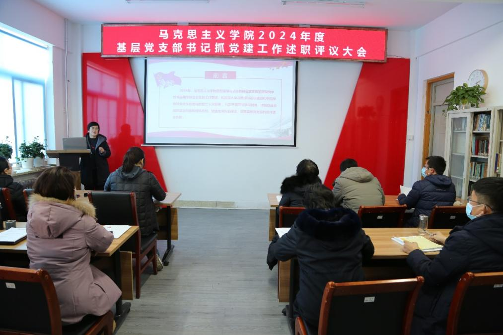 12月18日,马克思主义学院党总支在党员活动室召开了2024年度基层党支部书记抓党建述职评议会议。学院党总支委员、党支部书记、支部委员以及师生代表参加会议。会议由党总支副书记吴卫卫主持,院长兼党总支书记邱金英作总结讲话。