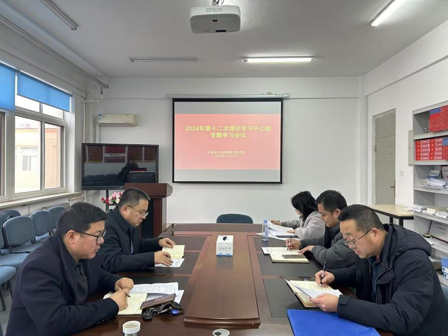 12月25日,外国语与国际教育学院党委在学院党员活动室召开2024年第十二次理论学习中心组专题学习会议。学院党委理论学习中心组成员参加学习。会议由学院党委书记杨建明主持。