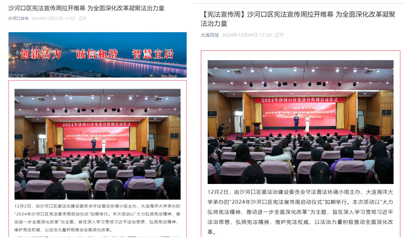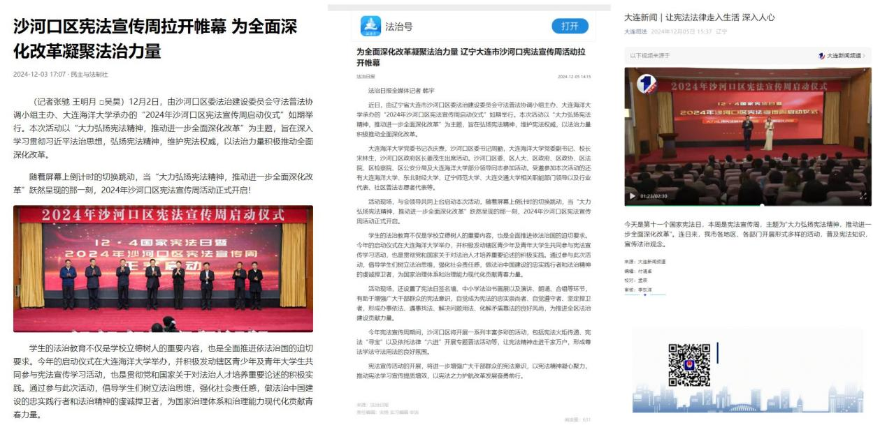 近日,法治日报、大连新闻频道、民主与法制社、大连司法、沙河口区委宣传部等多家媒体和单位报道我校举办的“2024年沙河口区宪法宣传周启动仪式”。