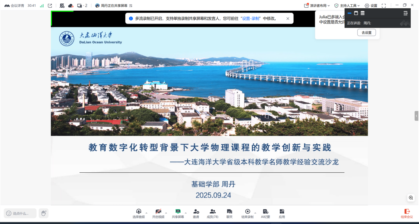 基础学部周丹教授以《教育数字化转型背景下大学物理课程的教学创新与实践》为题,系统分享了在课程体系构建与教学竞赛方面的探索成果与实践心得。