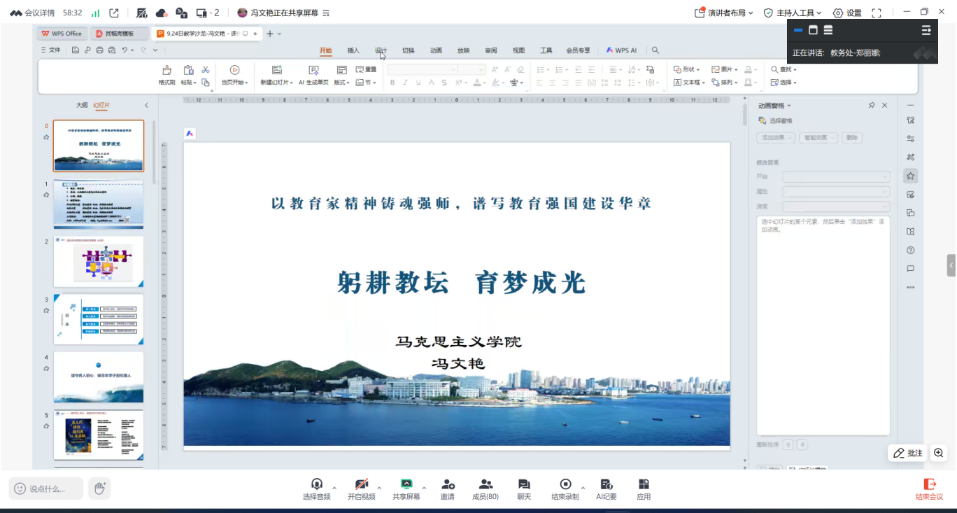 马克思主义学院冯文艳教授以《躬耕教坛育梦成光》为题,结合多年一线教学经历,深入交流了思想政治教育课程的教学理念与育人感悟。