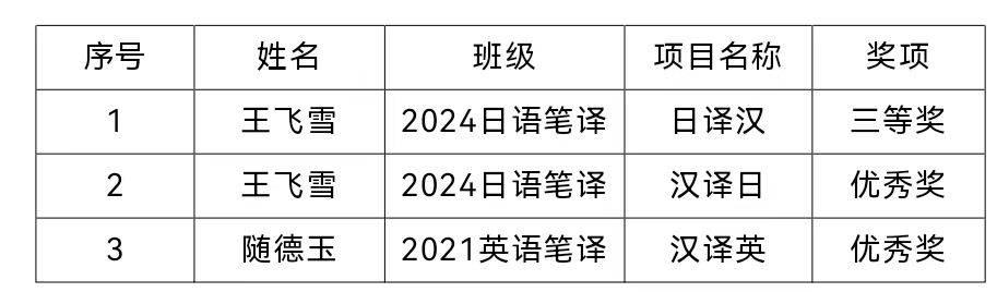 其中,2024级日语笔译专业研究生王飞雪在日语教师张苏指导下,凭借出色的双语转换能力与跨文化理解素养,一举荣获日译汉组三等奖和汉译日组优秀奖;2021级英语笔译专业研究生随德玉荣获汉译英组优秀奖。