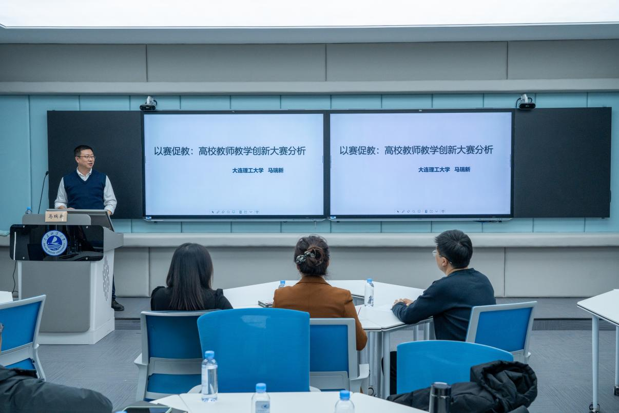 本次工作坊特邀大连理工大学求实书院执行院长马瑞新教授作题为《以赛促教:高校教师教学创新大赛分析》的专题讲座。马瑞新围绕教学创新大赛展开系统解读,既点明了赛事的核心价值,也深入解析了其顶层架构、全学科覆盖等核心特点。结合“校赛-省赛-国赛”三级选拔流程与晋级要求,依托自身丰富的参赛及评审经验,马瑞新详细拆解了课堂教学实录、创新报告及现场汇报的评分核心。从创新性课程的筹备,到逻辑严谨、亮点突出的报告撰写,他为教师细致梳理了全流程备赛要点;同时分享了跨学科整合、问题导向式课程等创新案例,并聚焦智能学习分析、区块链等数智化融合实践,为教师提供了极具针对性的备赛思路。