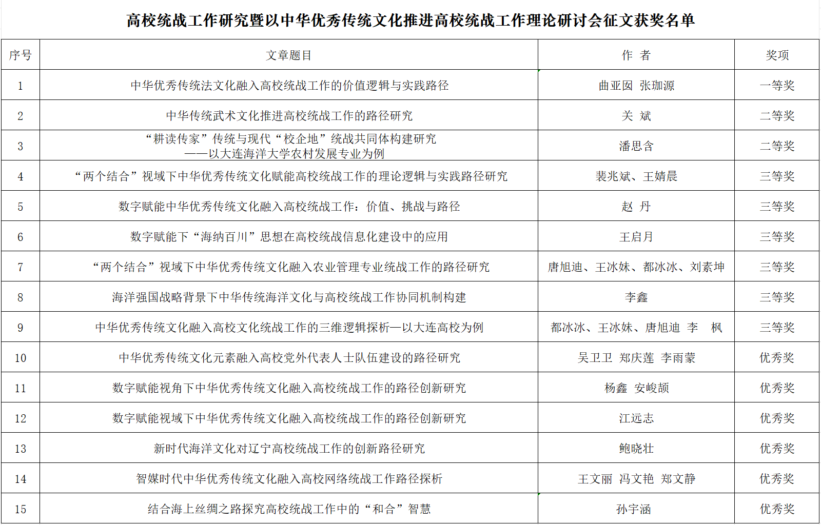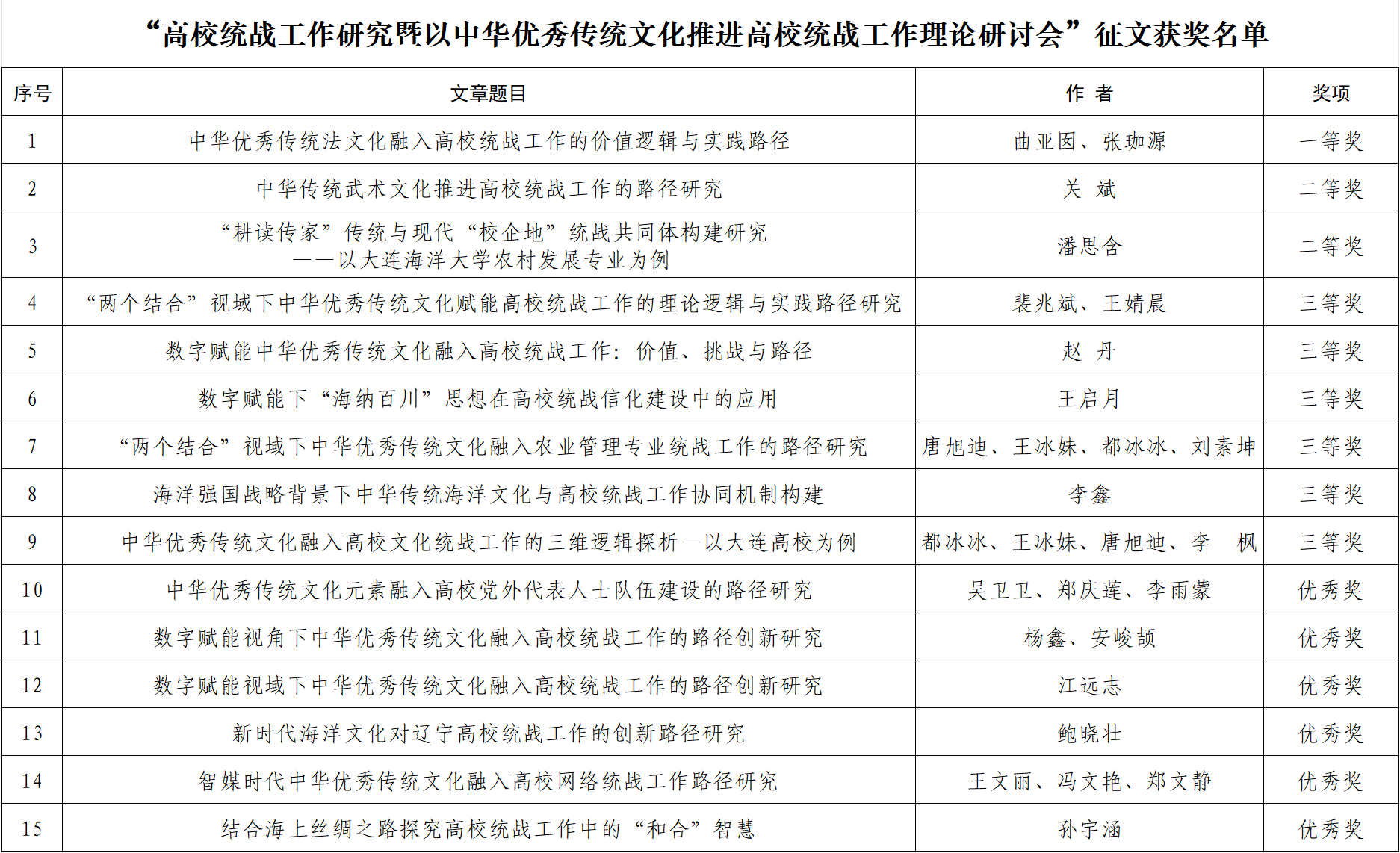 近日,2025年全省“高校统战工作研究暨以中华优秀传统文化推进高校统战工作理论研讨会”论文征集评选结果公布。我校在此次评选中表现突出,共荣获一等奖1项、二等奖2项、三等奖6项、优秀奖6项,并荣获“优秀组织奖”。